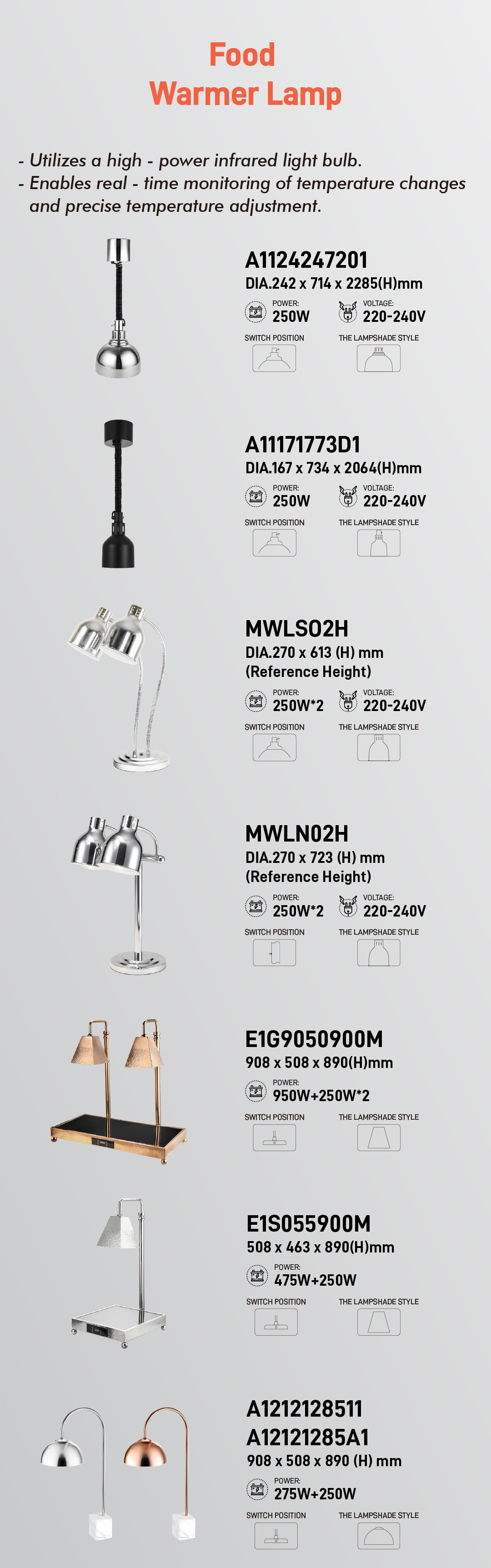 당사의 최신 푸드 워머 램프 시리즈는 여러분의 대표 요리가 의도한 대로 테이블에 정확하게 전달되도록 설계되었습니다. 즉, 뜨겁고 신선하며 시각적으로 놀랍습니다.
